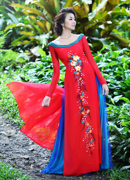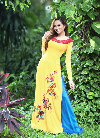 Les robes Ao dai dont le matériau principal est la soie du Vietnam avec des motifs spécifiques à la culture vietnamienne.